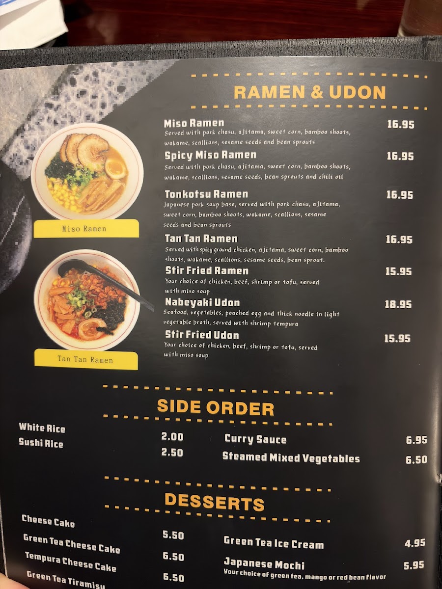 Accompanying the main dishes are thoughtful sides and sauces, like Curry Sauce or spicy mayo, that allow for a personalized dining experience. For a sweet finish, the dessert options—ranging from Tempura Ice Cream to delicate Green Tea Tiramisu—offer a gentle contrast to the savory courses.
